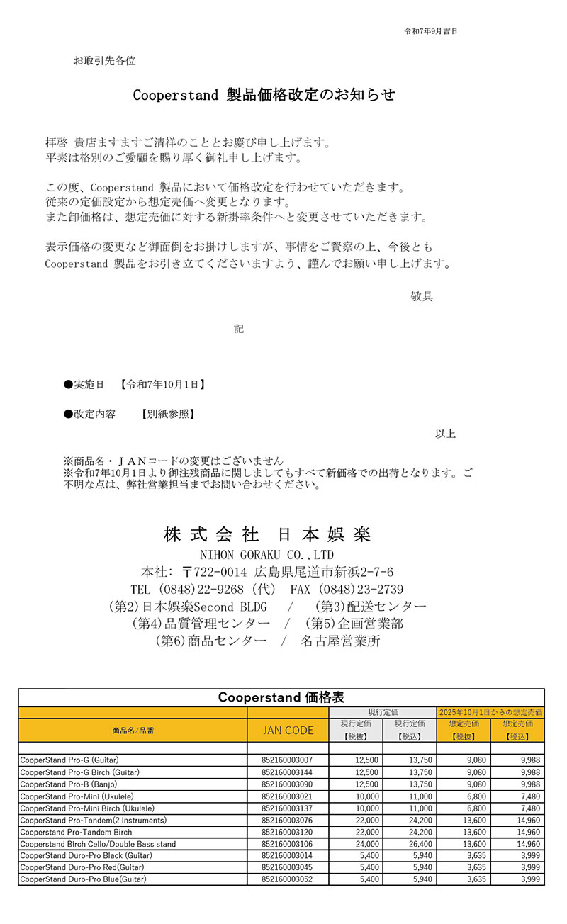 Cooperstand 価格変更のお知らせ。