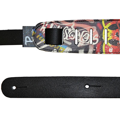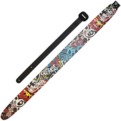 エアロスミスのデザインロゴレザーストラップ。スプレーアート調でカラフルな色使い。65mmの幅広タイプでストラップの長さは2cm間隔で調整可能です。