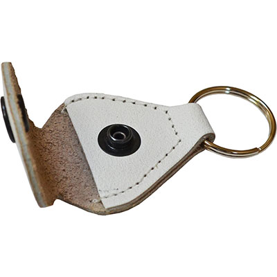 キーリング付きのレザー製ピックホルダー。スナップボタン留めタイプ。