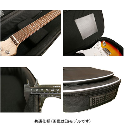 ハードケースの様にしっかりした外装を保ちつつ軽量ライトケースを実現。外からのダメージに強い20mm 厚のフォーム、ケース底面は滑り止めラバーで補強。大型Swingハンドルは移動時のストレスを軽減します。収納式のショルダーベルトは、使用しない場合に収納可能。内装にはネック枕を備え、痛みやすいブリッジ・ヘッド部分には裏地を補強。アクセサリー類の持ち運びに便利な充実の収納スペース。