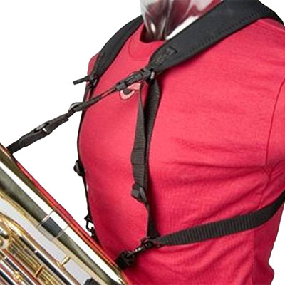 このチューバハーネスは、奏者の体にフィットし、奏者の動きに伴う振動を吸収しながら楽器の負荷を均一に分散させます。