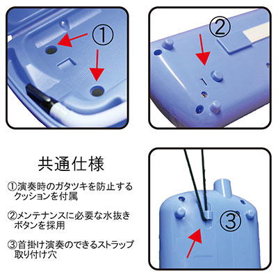 ■鍵盤数:32 鍵 ■音域:f-c''' ■カラー: ブルー/ ピンク/ グリーン ■本体サイズ:幅43cm× 奥行き10.5cm× 高さ4.5cm■ケースサイズ:幅47cm× 奥行き17cm× 高さ6cm ■重さ:500g( 本体) / 1070g( 総重量)■付属品:中空二重軽量ブローケース 立奏用唄口 卓奏用パイプ 名前シール クッション メンテナンスクロス 取扱説明書