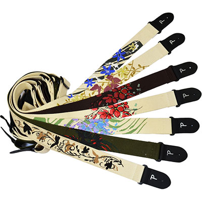 厚手のコットン素材のギターストラップ。手書き風イラストのプリントがオシャレなアイテム。ストラップの長さはスタイルに合わせて簡単に調整できます。