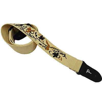厚手のコットン素材のギターストラップ。手書き風イラストのプリントがオシャレなアイテム。ストラップの長さはスタイルに合わせて簡単に調整できます。