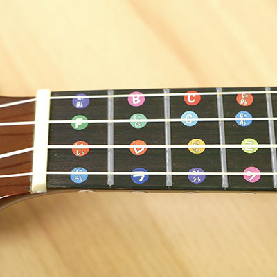 指板に貼って覚えよう。ウクレレのチューニングに配列されたカラフルなステッカーは音階やチューニングを覚えて演奏を楽しむ便利アイテム。