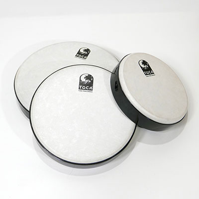 耐久性・軽量化に優れたPVC 合成樹脂ボディと、音程の安定したシンセティックヘッド。異なるサイズのヘッドは取り外し単体でフレームドラムとしての演奏だけで無く、重ねて省スペースで収納することが可能です。NESTING( 入れ子構造) の特長を活かした8"、10"、12" の3 サイズのセットは、学校やグループ演奏に最適です。