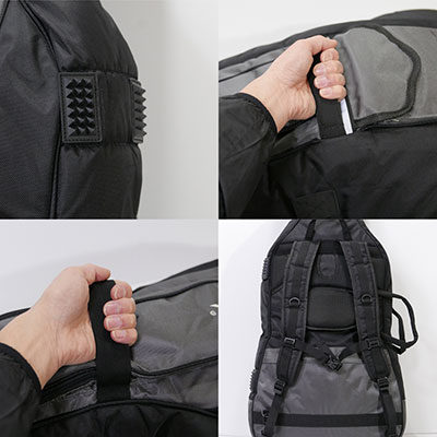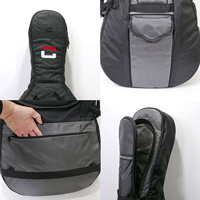 耐久性の高いポリエステル素材の生地に、20mmのクッションパッドを使用した外装。楽器にやさしい柔らかな裏地。スムーズな動作で信頼性の高いYKKファスナーを使用。表面に弓とアクセサリーを収納できる2箇所のポケット。裏面には楽譜を収納するのに最適なファスナー付ポケット。リュックタイプで使用可能なストラップは幅広い調整が可能で、長時間の移動でも蒸れの少ない通気性の高いパッド加工。