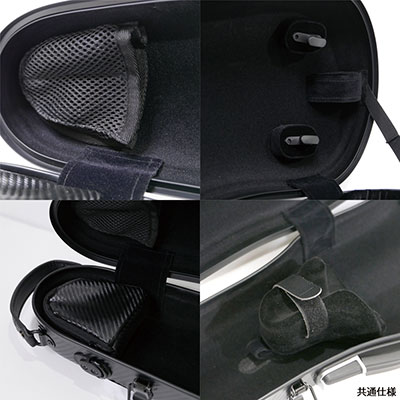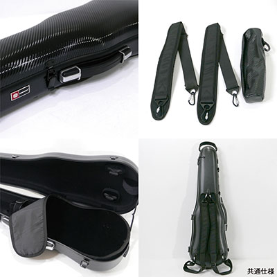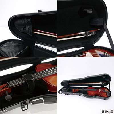 色鮮やかで艶の有るカーボンパターンが特徴のバイオリンケース。衝撃に強く、耐熱性にも優れたポリカーボネート素材と、軽量、耐衝撃性の代名詞といえるカーボンファイバーを組み合わせた「ポリカーボン」。内部は楽器の個体に合わせて移動可能なネック枕ピローが楽器をしっかりと固定。2本の弓が収納可能。便利なカーボン柄の取り外し可能なアクセサリーポーチと、ダストカバーが付属。ソフトな手触りで心地良いグリップハンドル。移動時にプレイヤーをサポートするクッション性の高いショルダーストラップが付属。