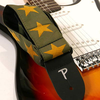 プリントとは一味違う様々なデザインに織り込ませ布地をストラップに張り合せたギターストラップ