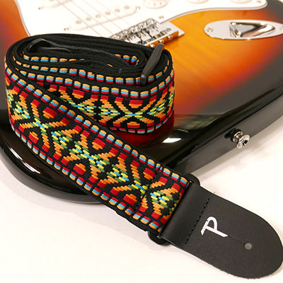 プリントとは一味違う様々なデザインに織り込ませ布地をストラップに張り合せたギターストラップ