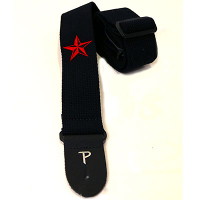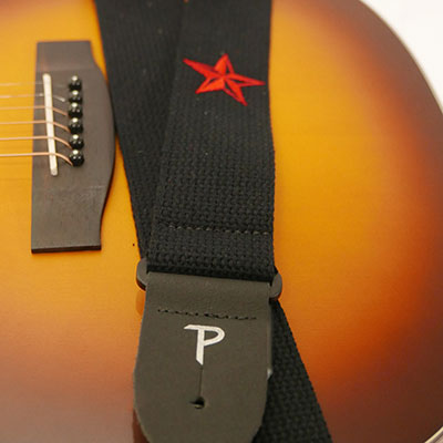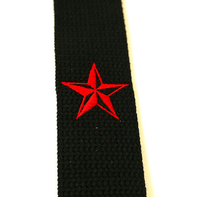 黒のコットン生地に刺繍のワンポイントデザインが入り、シンプルだけど存在感のあるストラップとなっています。