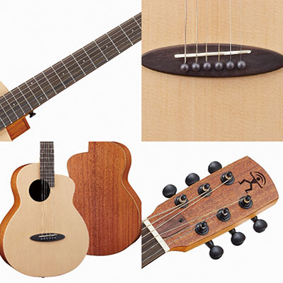 新シリーズ「MY」MODEL をラインアップ。ミニサイズのアコースティックギターとして発売以来、独自のボディデザインでサウンドだけでなく演奏性でも評価の高いBirdGuitar。コストとサウンドのバランスに優れた「aNN-MY10」は、ミニギターと感じさせないバランスの良いサウンドを奏でるオフセットサウンドホール構造と、ボディトップ材に明るく張りのある音質が特徴のソリッドスプルース、サイドバック材には耐久性が向上するラミネートマホガニーを採用。ヘッドトップにはブランドイメージを象徴するレーザーエッジングのロゴデザイン。弦振動を逃がすことなく伝えるオーバルデザインのブリッジと、プレイヤーの指先が触れ合う指板には、硬度が高く適度な油分を含んだローズウッドを使用。オープンポア仕上げの塗装は木材のナチュラルな質感を損なわず、ボディ振動への影響が少ない極薄仕上げです。これから始めるプレイヤーはもちろん、長くアコースティックギターを親しむ方にも納得頂けるミニギターです。