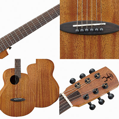 新シリーズ「MY」MODEL をラインアップ。ミニサイズのアコースティックギターとして発売以来、独自のボディデザインでサウンドだけでなく演奏性でも評価の高いBirdGuitar。コストとサウンドのバランスに優れた「aNN-MY20」は、ミニギターと感じさせないバランスの良いサウンドを奏でるオフセットサウンドホール構造と、ボディトップ材は暖かくリッチでクリアな音質が特徴のソリッドマホガニー、サイドバック材には耐久性が向上するラミネートマホガニーを採用。ヘッドトップにはブランドイメージを象徴するレーザーエッジングのロゴデザイン。弦振動を逃がすことなく伝えるオーバルデザインのブリッジと、プレイヤーの指先が触れ合う指板には、硬度が高く適度な油分を含んだローズウッドを使用。オープンポア仕上げの塗装は木材のナチュラルな質感を損なわず、ボディ振動への影響が少ない極薄仕上げです。これから始めるプレイヤーはもちろん、長くアコースティックギターを親しむ方にも納得頂けるミニギターです。