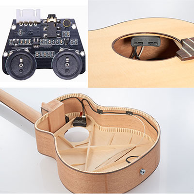 ピックアップ付モデルに採用されている「aNueNueAir Air」は、アンダーサドルのピエゾピックアップのサウンドに、コントロールサーキット内に組み込まれたマイクでボディ内のサウンドをプラスできる「デュアルピックアップシステム」です。