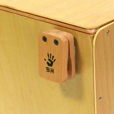 木製のカスタネットは、S/L の異なるサイズとジングルを合わせた3種類のバリエーションで、軽やかなリズムをカホンやパーカッションサウンドにプラスします。カホンへの取付は粘着テープ使用した面ファスナーで簡単に取り外しが可能です。