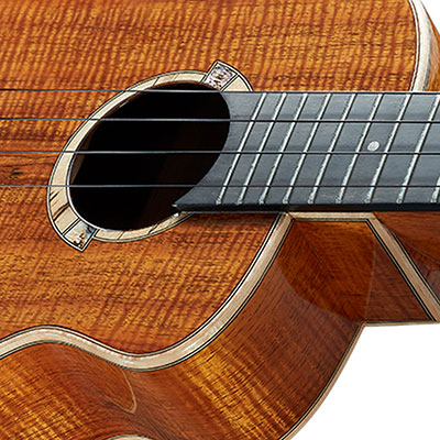 ウクレレの木材として最も代表的なKoa 材の中でも5A グレードを使用した、立体的で深みの有る外観は、最上位モデルとしてふさわしいエレガントで美しさが際立つ仕上がりになっています。ヘッドプレート、ブリッジ、フィンガーボードには、音質、外観ともに引き締まった要素を与えるエボニー素材を使用。各装飾には美しい輝きのアバロンをさり気なく配しています。サウンドはもちろん、手にするプレイヤーを美しく演出するウクレレです。