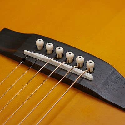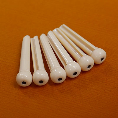 ABS樹脂素材の一般的なブリッジピンです。アコースティックギター全体のワンポイントとしてカラーを変えることで印象が変わります。2mmドットがアクセントの3 カラーからお選びください。