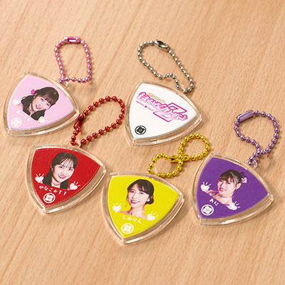ももクロ ギターピック ハメパチセット! ももクロ・ギターピック5枚とそれを入れるためのアクリルキーホルダー(ハメパチ)が5個セットになった特別仕様です。ボールチェーンもメンバーのイメージカラーにしたこだわりのアイテムです。