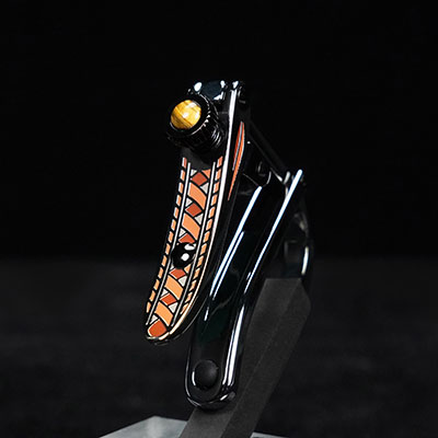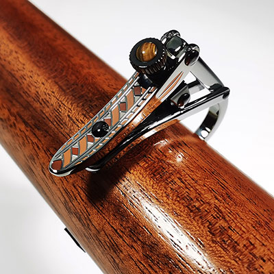 50周年限定アニバーサリーコレクション第3弾、C1z - Rossete -モデル。 耐久性のあるエナメルで上品に装飾されたロゼットは、弦楽器製作者が最高級のカスタムクラシックギターで好むパターンを彷彿させ、タイガーアイのインレイが施されています。