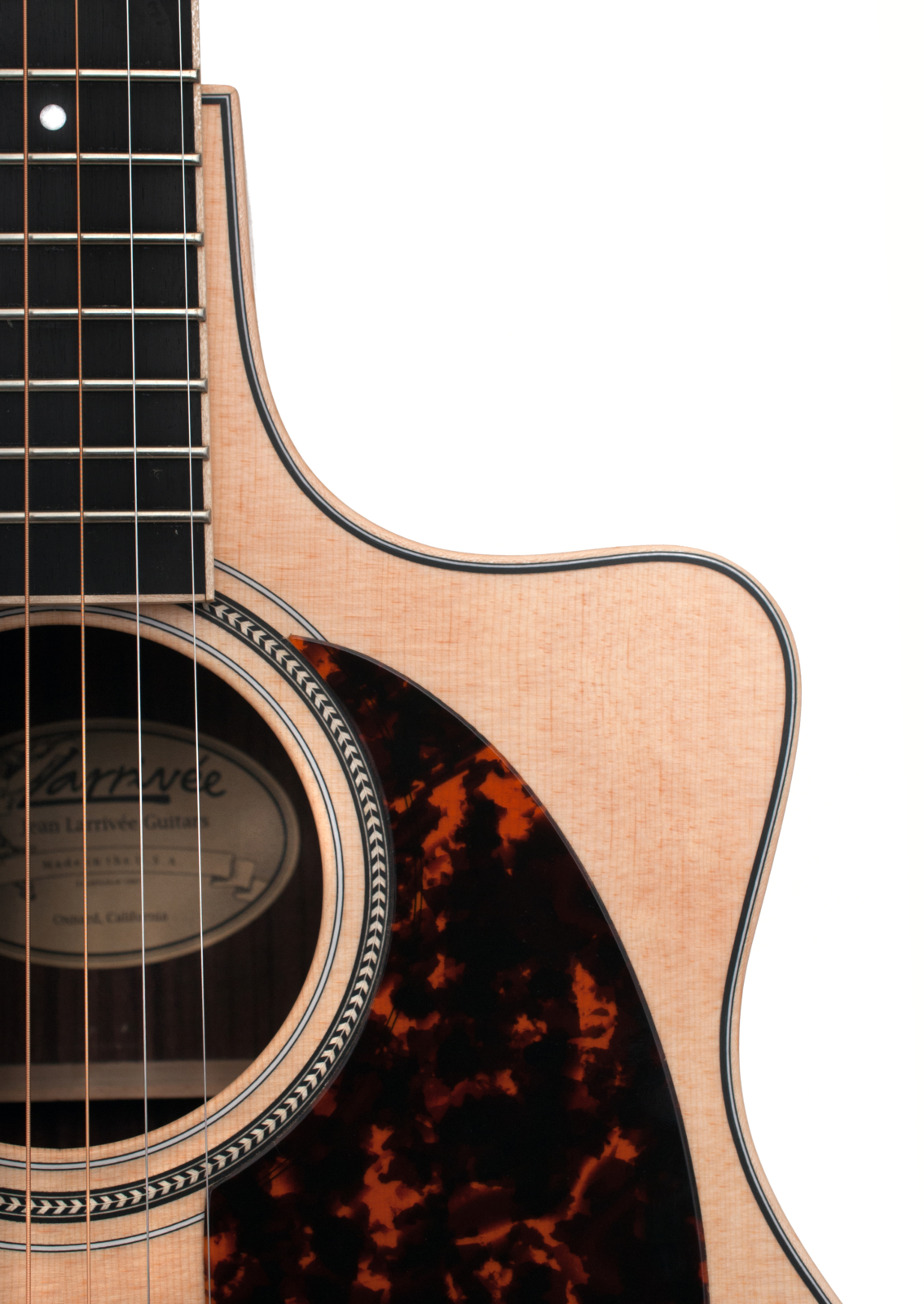 | Inlays & Pickguard | Larrivee Headstock Logo Inlay & Dot Fingerboard Inlay, & Tortoise PG, and L.R. Baggs Stage Pro Element |