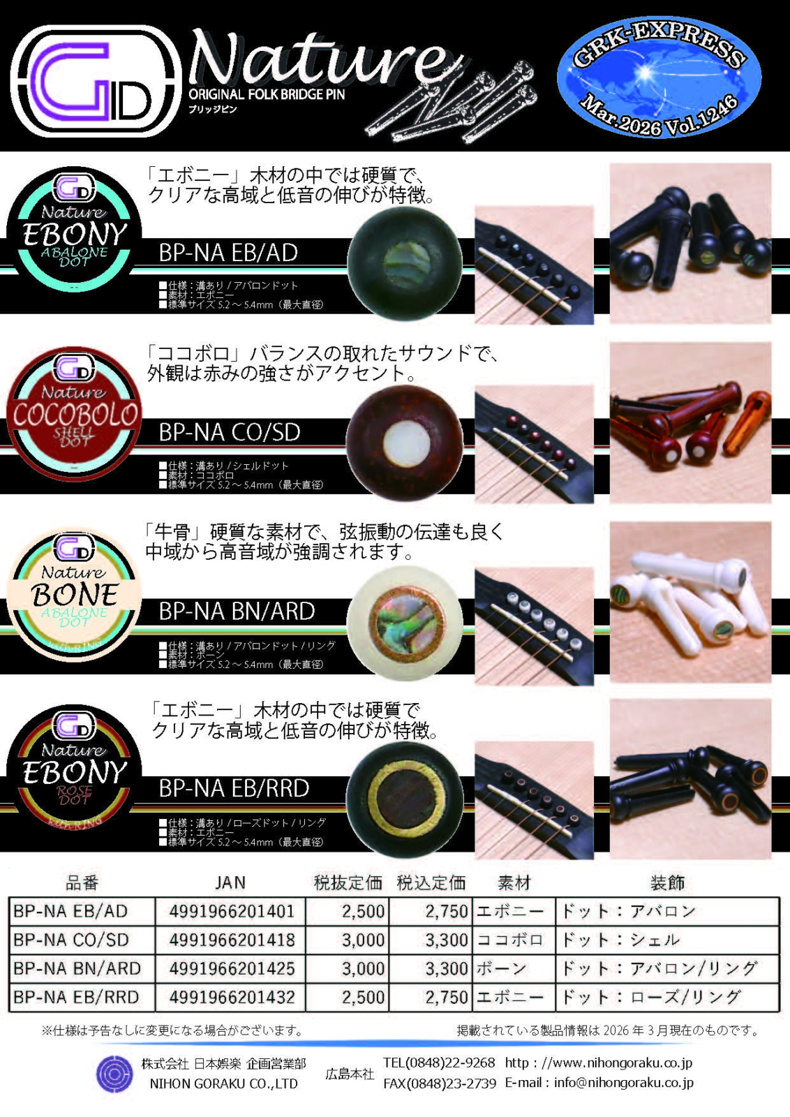 GID Bridge Pins Nature Ebony/Abalone Dot [BP-NA EB/AD]